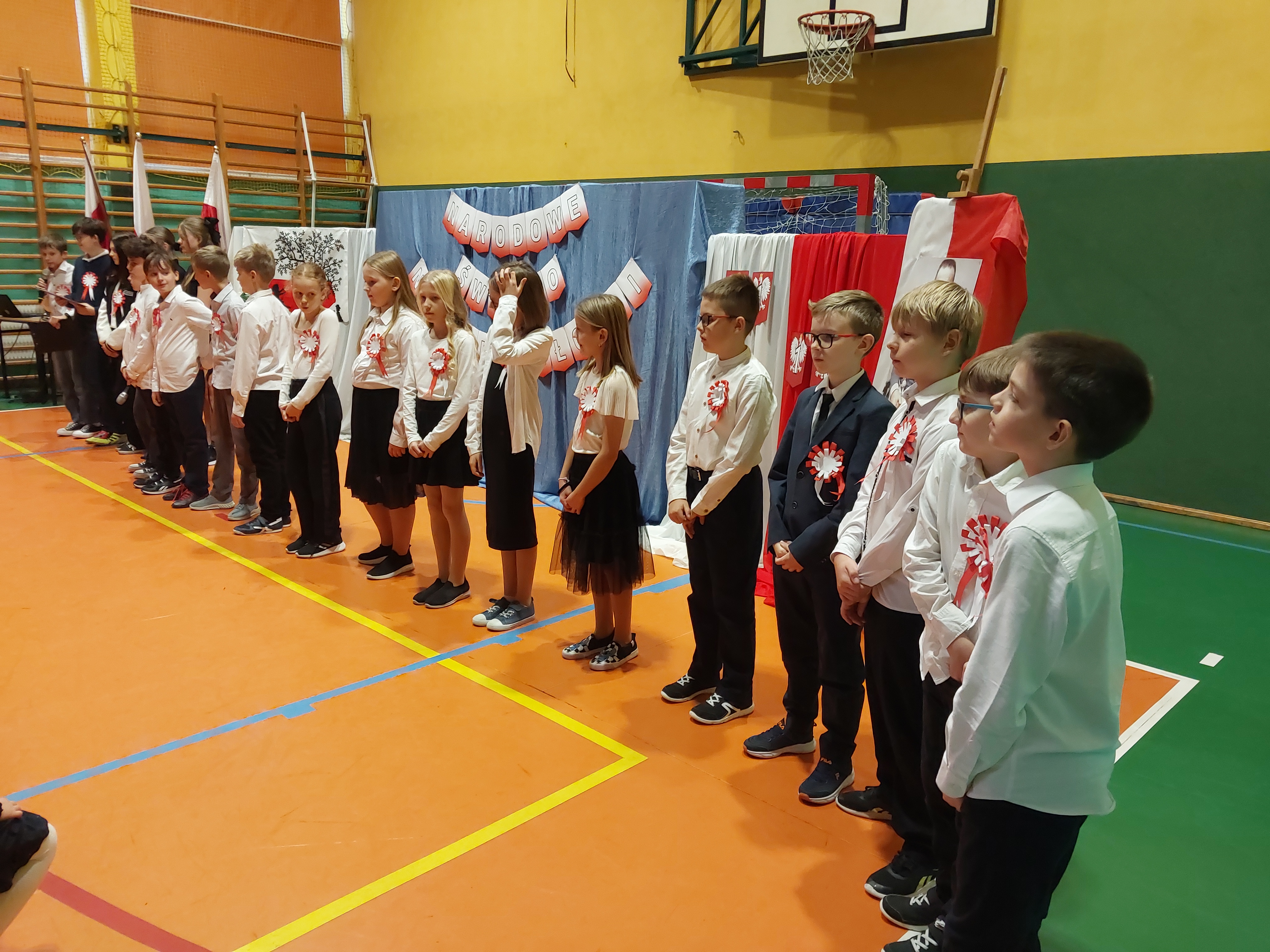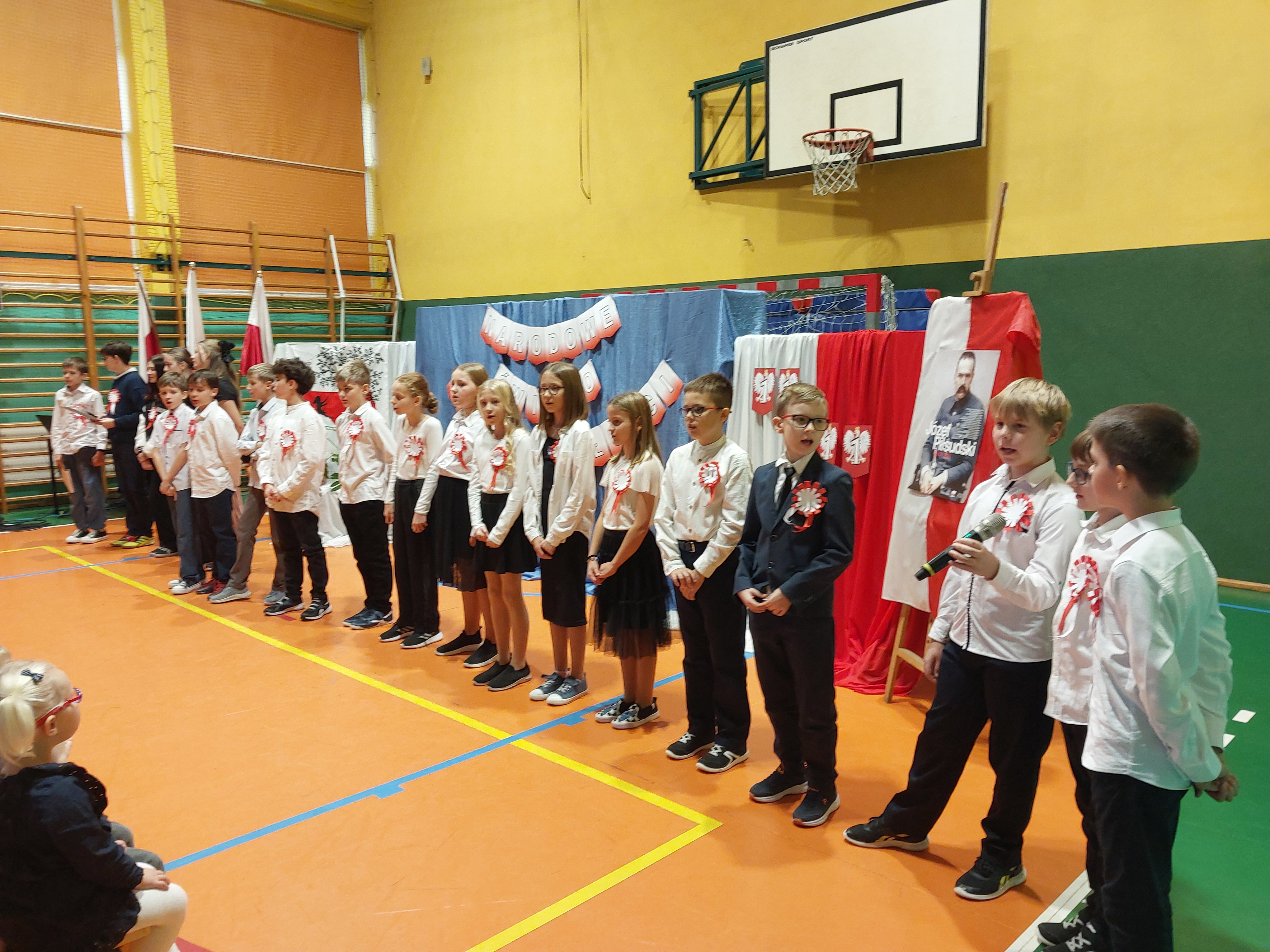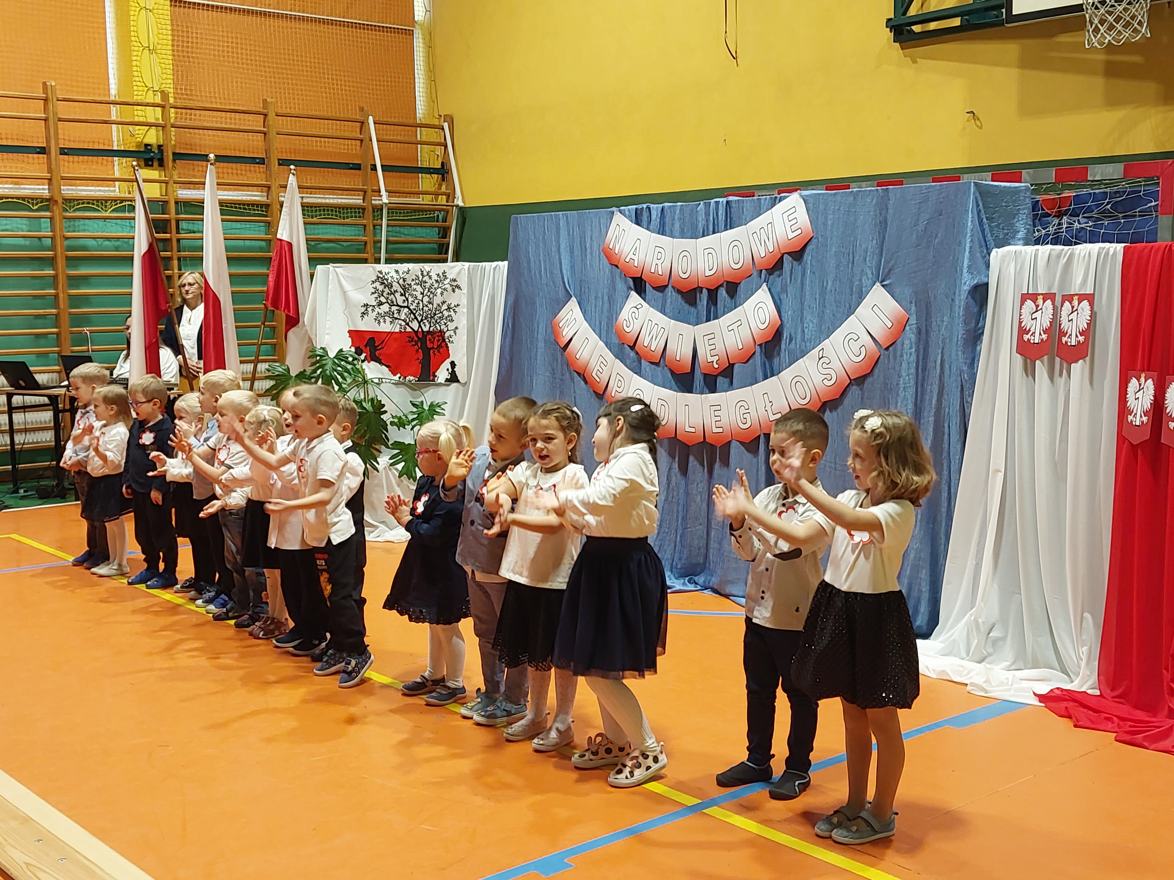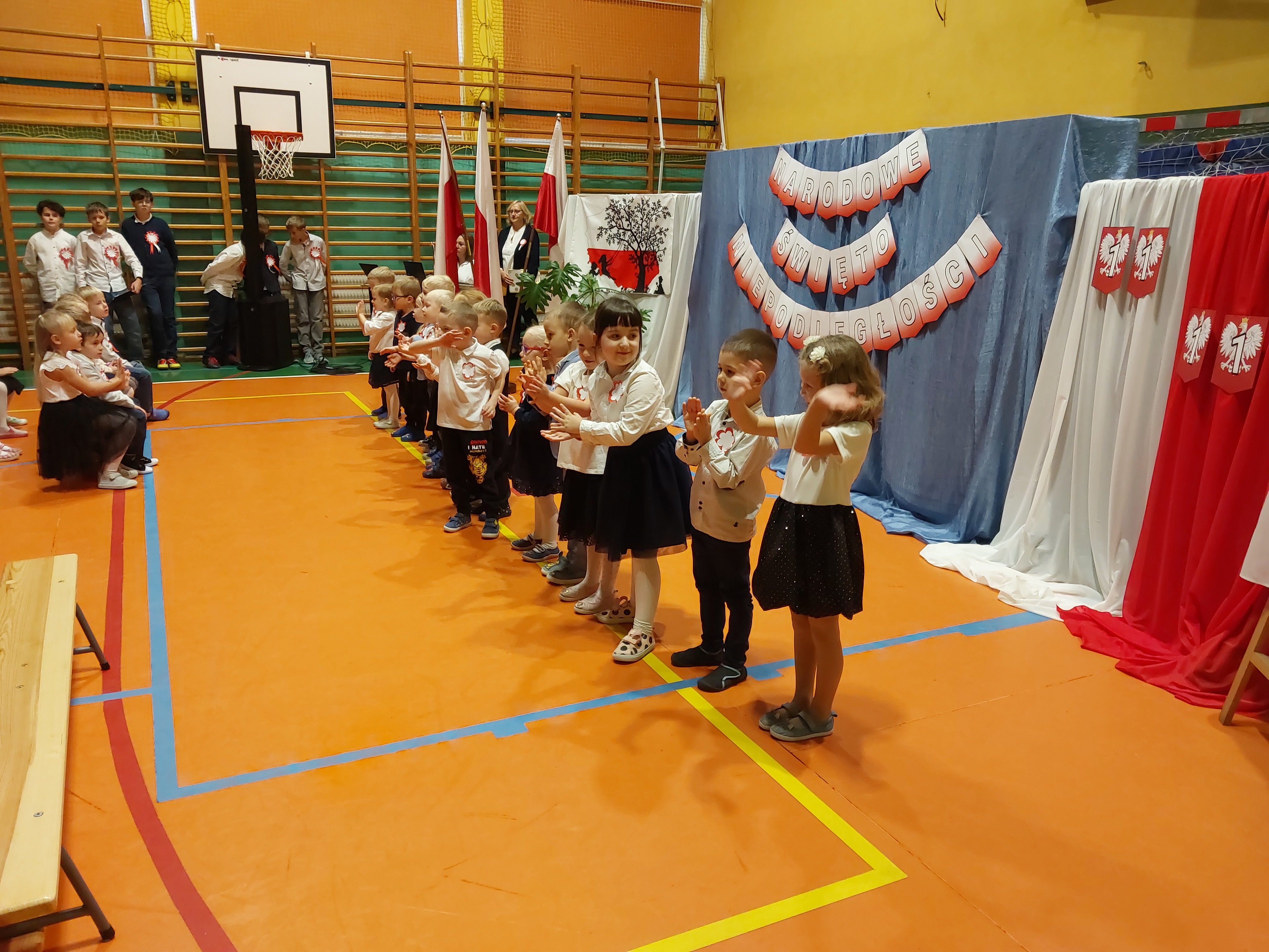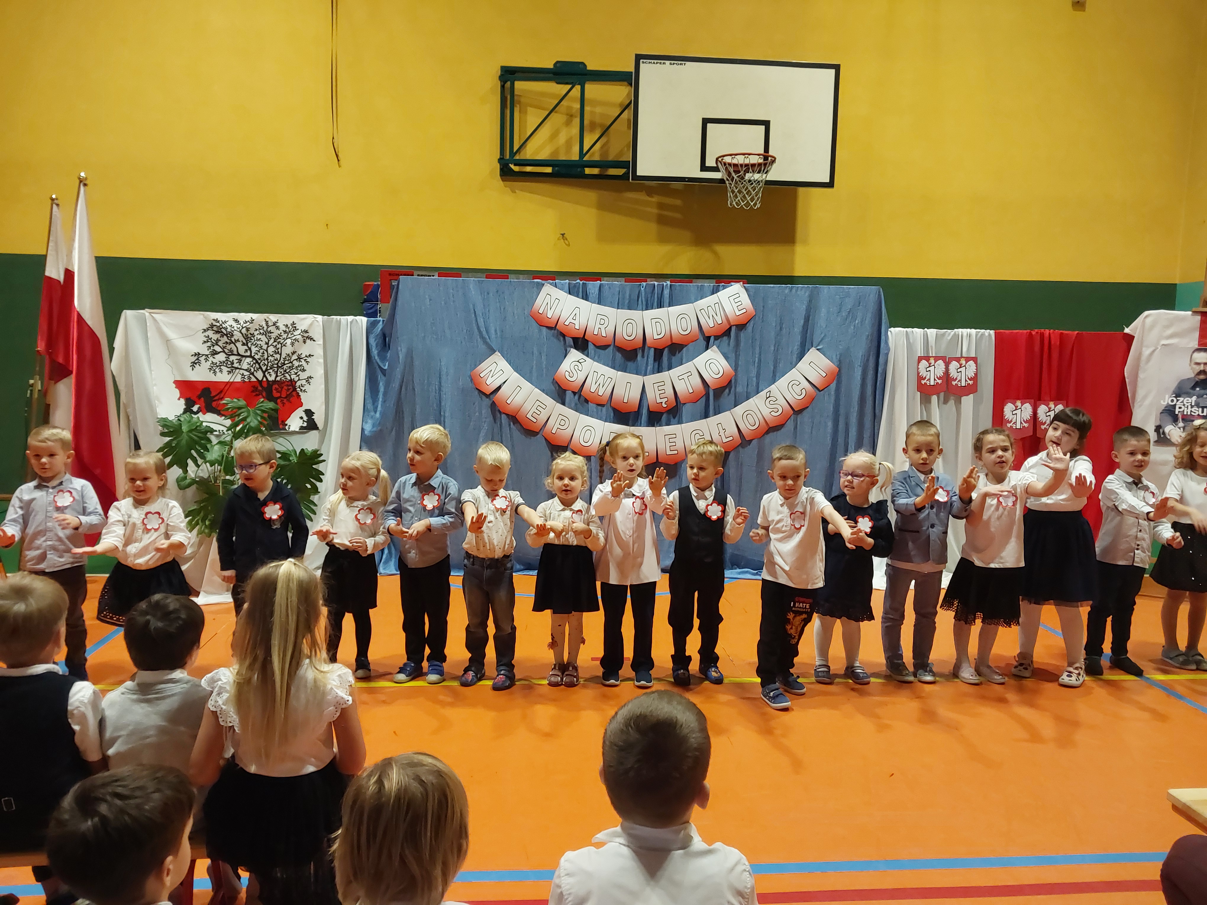Potem przedszkolaki zaśpiewały patriotyczne piosenki, a klasy 4-7 zaprezentowały krótki występ na temat historii odzyskania przez nasz kraj niepodległości.