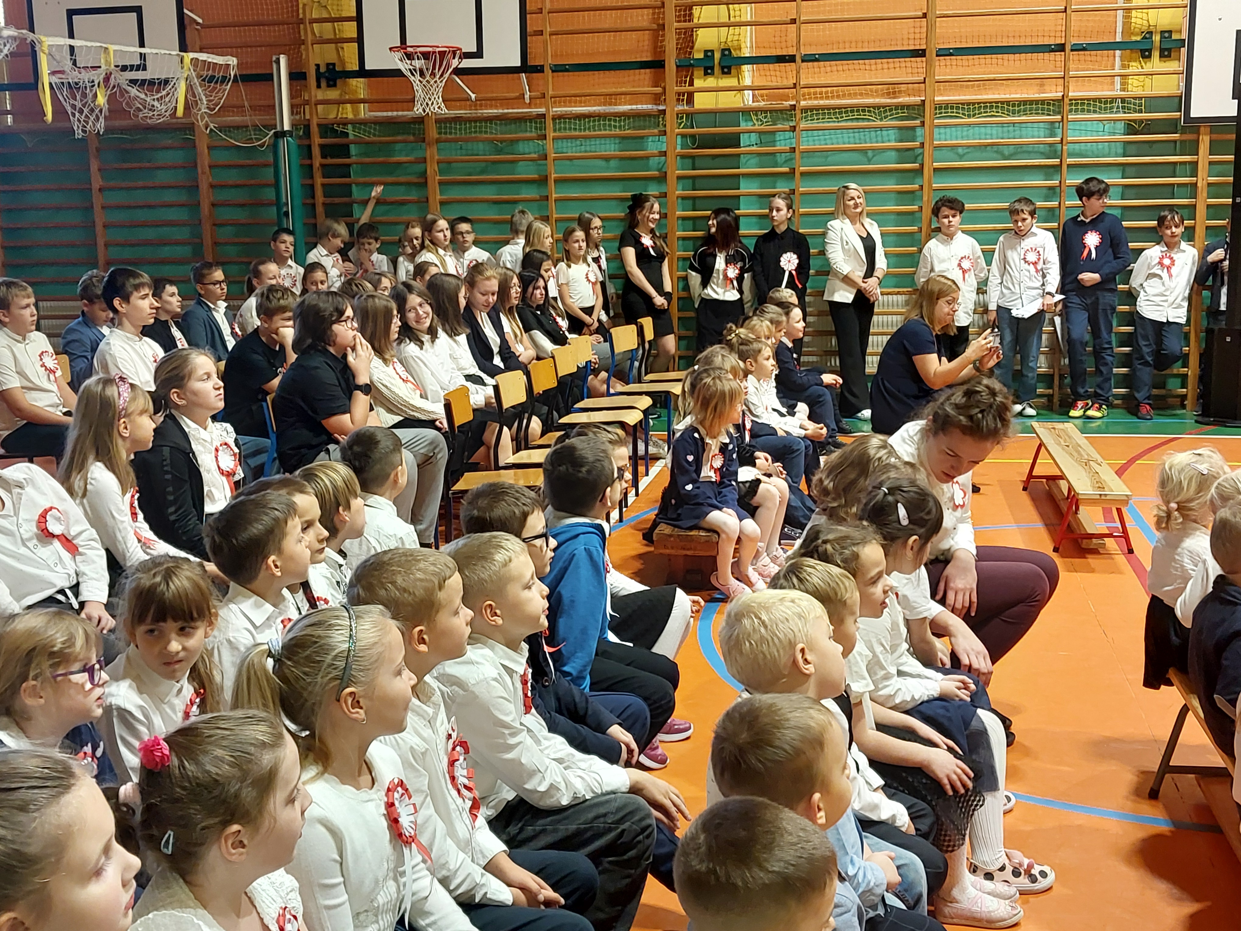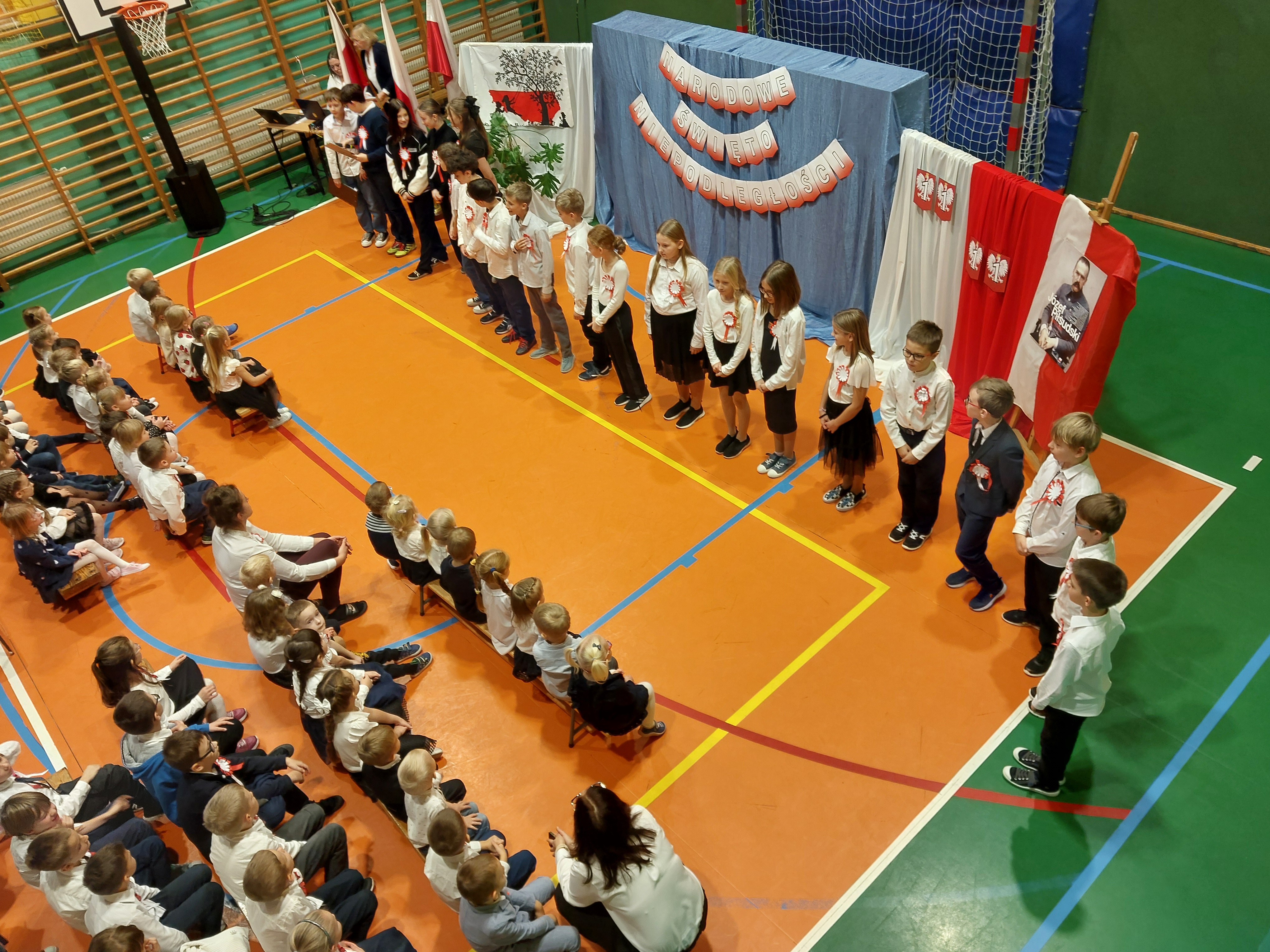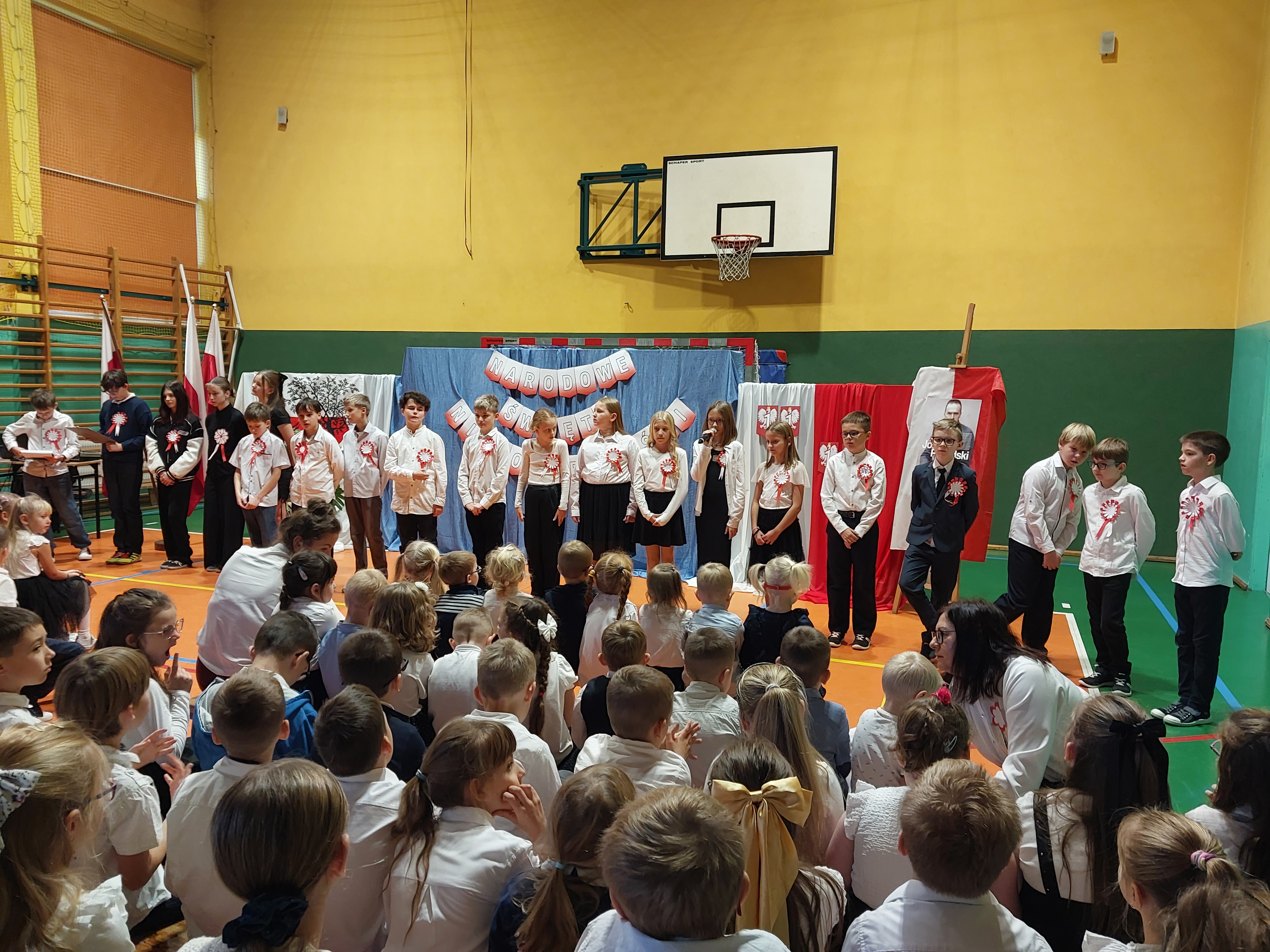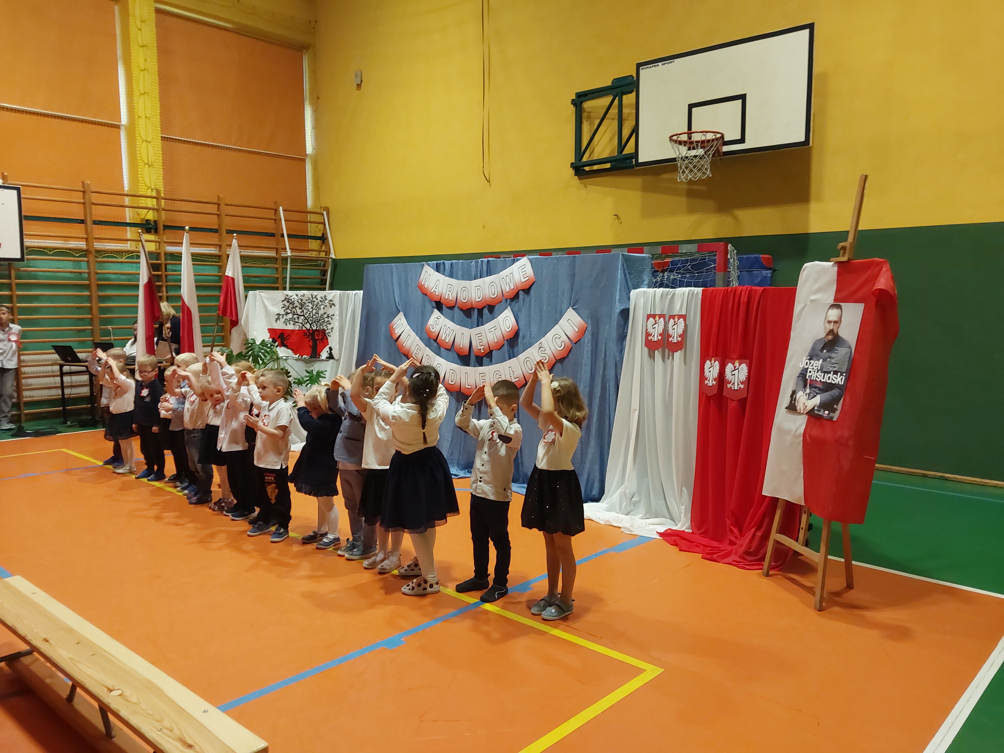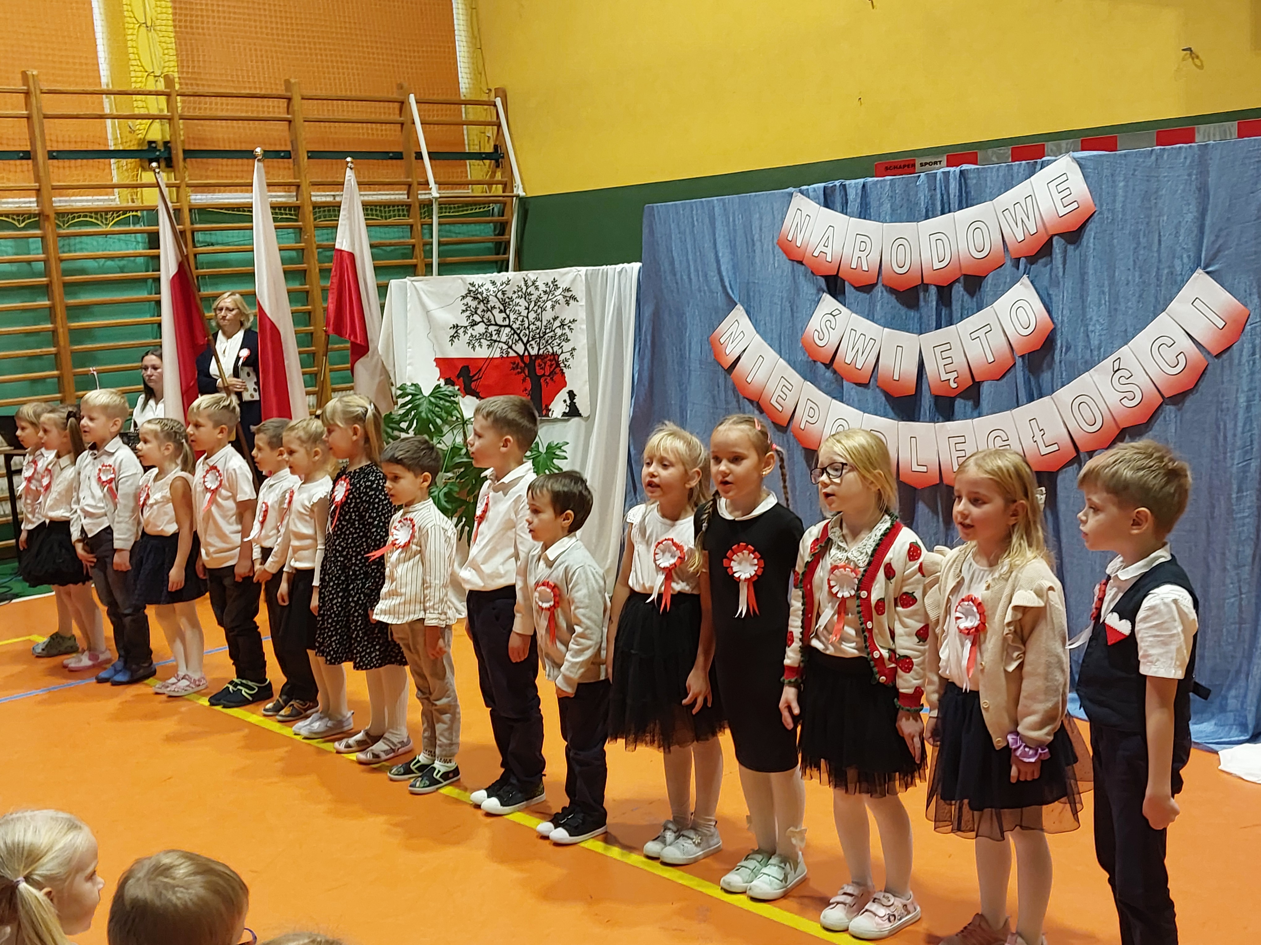 Potem przedszkolaki zaśpiewały patriotyczne piosenki, a klasy 4-7 zaprezentowały krótki występ na temat historii odzyskania przez nasz kraj niepodległości.